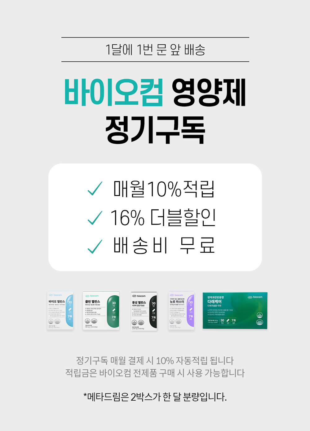 | ※ 안심환불 방법 해당제품: 바이오밸런스, 클린밸런스 , 풍성밸런스, 뉴로마스터, 다래케어 , 메타드림 해당제품 외 다른 제품은 안심환불에 해당 되지 않습니다 | • 환불 조건 1. 제품 수령 후 30일 동안 꾸준히 섭취하신 경우에 환불 가능합니다. 2. 환불 신정은 제품 수령 후 40일 이내에 신청이 가능합니다. 3. 복수 구매 또는 세트 상품 구매 시 동일 종류의 1개만 개봉한 경우 전액 환불이 가능합니다. (ex. 5개 구매 후 1개만 개봉 시 5개 전액 환불, 5개 구매 후 5개 모두 개봉 시 1개만 환불) 4. 왕복 배송비는 고객님 부담입니다. • 환불 신청 1. 바이오컴 1:1 채팅 상담에 '30일 체험 후 환불 신청합니다' 문구와 함께 상품명, 구매일, 구매자 성함, 구매자 연락처, 환불 받으실 계좌번호, 환불 요청할 제품의 상태 사진을 남겨주세요. 2. 사진 확인 및 답변을 받은 후 왕복 배송비 6,000원을 아래 계좌로 입금해주세요. 계좌 : 기업은행 988-020725-04-013 (주)바이오컴 3. 배송비 입금이 확인된 후 제품 회수가 진행됩니다. 4. 상품 상태 확인 후 환불 처리가 완료됩니다. |