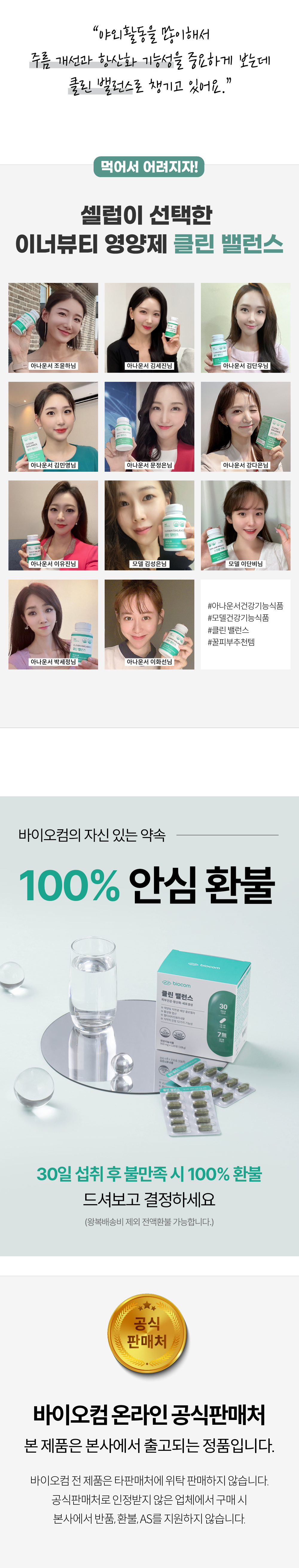 | ※ 안심환불 방법 해당제품: 바이오밸런스, 클린밸런스 , 풍성밸런스, 뉴로마스터, 다래케어 , 메타드림 해당제품 외 다른 제품은 안심환불에 해당 되지 않습니다 | • 환불 조건 1. 제품 수령 후 30일 동안 꾸준히 섭취하신 경우에 환불 가능합니다. 2. 환불 신정은 제품 수령 후 40일 이내에 신청이 가능합니다. 3. 복수 구매 또는 세트 상품 구매 시 동일 종류의 1개만 개봉한 경우 전액 환불이 가능합니다. (ex. 5개 구매 후 1개만 개봉 시 5개 전액 환불, 5개 구매 후 5개 모두 개봉 시 1개만 환불) 4. 왕복 배송비는 고객님 부담입니다. • 환불 신청 1. 바이오컴 1:1 채팅 상담에 '30일 체험 후 환불 신청합니다' 문구와 함께 상품명, 구매일, 구매자 성함, 구매자 연락처, 환불 받으실 계좌번호, 환불 요청할 제품의 상태 사진을 남겨주세요. 2. 사진 확인 및 답변을 받은 후 왕복 배송비 6,000원을 아래 계좌로 입금해주세요. 계좌 : 기업은행 988-020725-04-013 (주)바이오컴 3. 배송비 입금이 확인된 후 제품 회수가 진행됩니다. 4. 상품 상태 확인 후 환불 처리가 완료됩니다. |