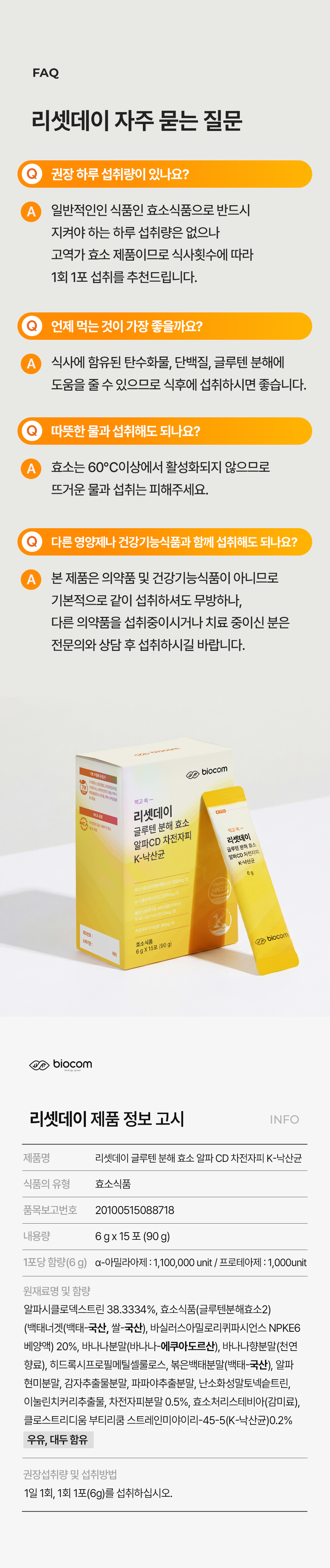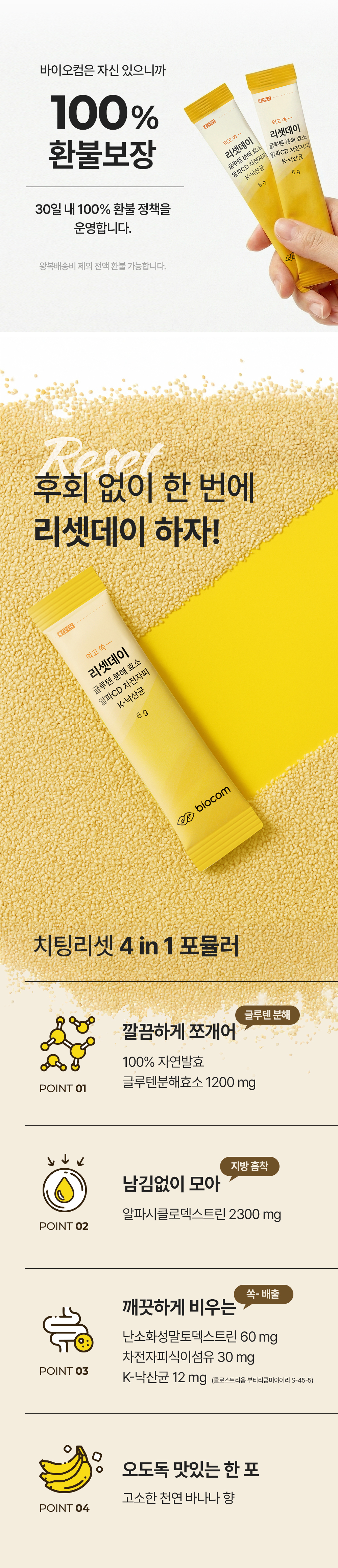 | ※ 안심환불 방법 해당제품: 바이오밸런스, 클린밸런스 , 풍성밸런스, 뉴로마스터, 다래케어 , 메타드림 해당제품 외 다른 제품은 안심환불에 해당 되지 않습니다 | • 환불 조건 1. 제품 수령 후 30일 동안 꾸준히 섭취하신 경우에 환불 가능합니다. 2. 환불 신정은 제품 수령 후 40일 이내에 신청이 가능합니다. 3. 복수 구매 또는 세트 상품 구매 시 동일 종류의 1개만 개봉한 경우 전액 환불이 가능합니다. (ex. 5개 구매 후 1개만 개봉 시 5개 전액 환불, 5개 구매 후 5개 모두 개봉 시 1개만 환불) 4. 왕복 배송비는 고객님 부담입니다. • 환불 신청 1. 바이오컴 1:1 채팅 상담에 '30일 체험 후 환불 신청합니다' 문구와 함께 상품명, 구매일, 구매자 성함, 구매자 연락처, 환불 받으실 계좌번호, 환불 요청할 제품의 상태 사진을 남겨주세요. 2. 사진 확인 및 답변을 받은 후 왕복 배송비 6,000원을 아래 계좌로 입금해주세요. 계좌 : 기업은행 988-020725-04-013 (주)바이오컴 3. 배송비 입금이 확인된 후 제품 회수가 진행됩니다. 4. 상품 상태 확인 후 환불 처리가 완료됩니다. |